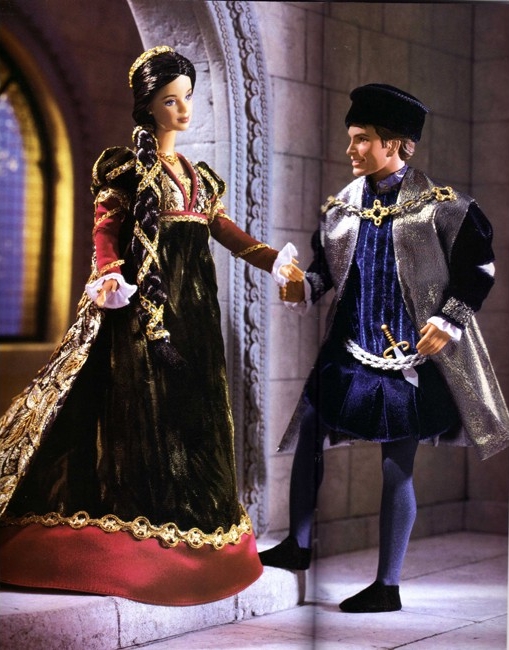 Příběh Williama Shakespeara - Romeo a Julie je jeden z celosvětově nejvíce ceněných příběhů o mladé lásce. Kdo by mohl lépe zachytit krásu a naléhavost skutečné lásky než Barbie a Ken. Jejich oděvy jsou vyrobeny tak, aby perfektně zachytily komplikovanost a bohatost módy 16. století. Barbie má na sobě sametový oděv s bohatou zlatou obrubou a pozoruhodnou bohatě zdobenou vlečkou, která se snáší z jejích ramen. Rukávy jsou zakončené elegantní krajkou, vrchní část rukávů je bohatě nabíraná a zdobená. Její hnědé vlasy zdobí nádherná zlatá čelenka. Ken Romeo, její mladý milovník, je oblečen do modré sametové tuniky s dlouhou a splývavou stříbrnou vestou, zdobený řetěz, který se perfektně hodí k jeho statné postavě a modrý sametový klobouk. Součástí Romeova oděvu jsou velice elegantní modré kamaše a na nohách má dobové černé boty. Součástí je samozřejmě certifikát pravosti (Certificate of Authenticity).
