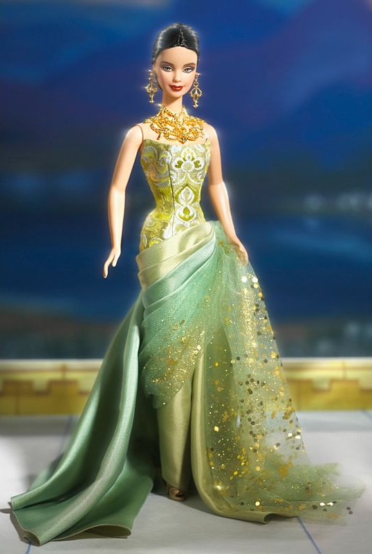 Exotická Beauty Barbie (Exotická kráska) má na sobě opravdu jedinečnou bezramínkovou zelenou saténovou róbu a zelený žakárový korzet. Sukně je svěšená k jedné straně a je překrytá zeleným tylovým pásem pokrytým zlatým zdobením. Její nádherné černé vlasy jsou stažené dozadu do malého elegantního drdolu. Exkluzivními doplňky jsou neuvěřitelně nádherný, umělecky propracovaný zlatý náhrdelník a krásné zlaté náušnice.