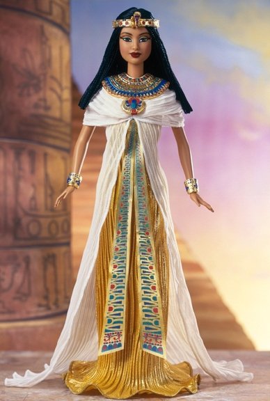 Z Barbie - Princezny Nilu, vyzařuje královské kouzlo v jemně zvlněných zlatých šatech se sněhobílým plédem, který padá k zemi kolem jejích ramen. Na krku má panenka velkolepý zlatý náhrdelník v barvách tyrkysové, červené, a modré, kterému vévodí fantastický zlatý medailon se staroegyptským motivem - skarabem. Mezi další klenoty, které zdobí tuto exkluzivní Barbie patří zlaté, barevně zdobené náramky a úžasná zlatá, drahými kameny zdobená korunka jíž v přední části vévodí hlava kobry, která je egyptským symbolem královské hodnosti. Exotické líčení a úzká zlatá barevnými aplikacemi doplněná stuha ucelují famózní královský vzhled princezny.
